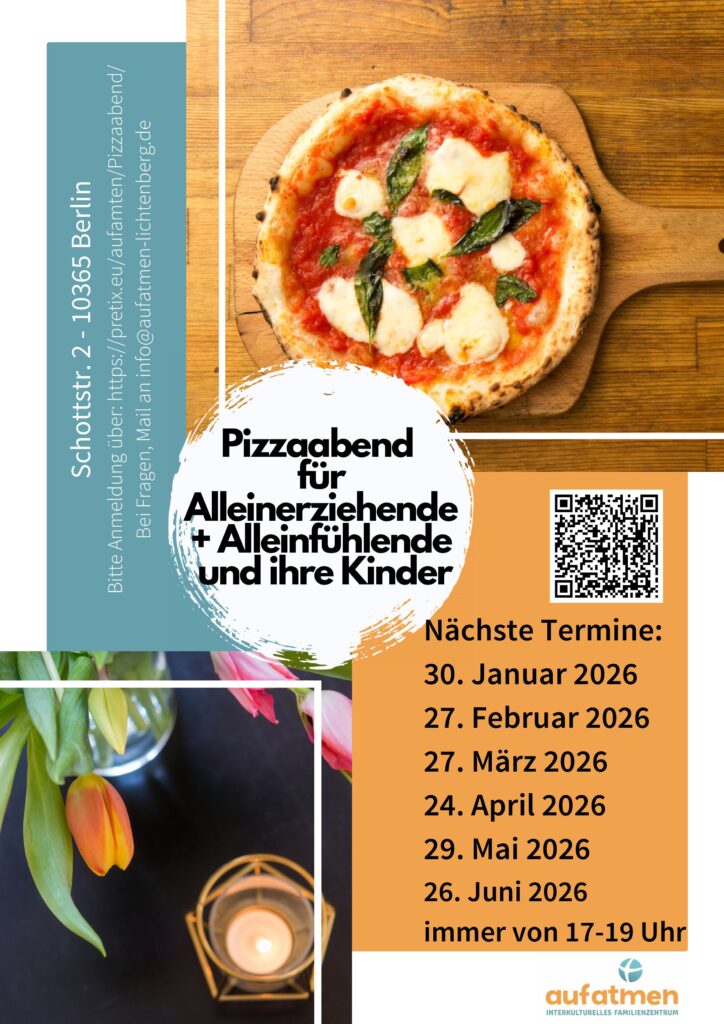 Einmal im Monat lädt das Familienzentrum aufatmen alleinerziehende Eltern und ihre Kinder herzlich ein, einen gemütlichen Abend zu verbringen und kostenfrei die frisch gebackene Pizza zu genießen. Während die Kinder spielen oder malen können, gibt es die Möglichkeit zum Austausch und Kennenlernen von Angeboten für Alleinerziehende im Bezirk.